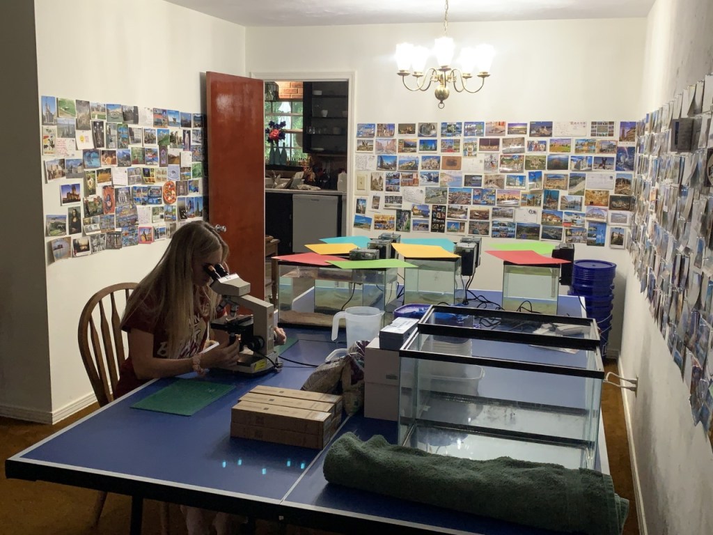 COVID-19 has definitely been a challenge to work with. Instead of working in a lab with preexisting lab equipment, we had to start from scratch, gathering much of what we could from Amazon and setting it up in the living room of Morgan’s home. Thankfully our advisor, Dr. Janie Wulff, was able to provide us with some needed lab supplies including 6 tanks, 2 microscopes, and some tupperware. Her assistance allowed us to expand some of our research areas as we couldn’t have bought our own microscopes. Due to a lack of a large lab space we resulted in using my ping pong table as the main lab area, with 6 full tanks with filters and all set up. We’ve also had to construct our own quadrants and Secchi disk instead of borrowing these materials from the lab. Our original plan was to rent a boat in Port Saint Joe, however, now we are using Morgan’s grandfather’s boat to limit exposure. This also meant Morgan had to ask to borrow her mother’s F-150 truck to tow the boat for 3 months, since her and Ben’s vehicle were incapable. Luckily both Tex Hawkins (grandfather) and Angie Hawkins (mother) were very gracious and helpful in supporting Morgan and Ben during this experiment. Much of our materials were ordered from Amazon, but for filters, salt water, sand, air pumps, we relied on local businesses. They were excited for our support, assisting us with picking out materials, and gave advice for how to establish saltwater tanks. It was very fulfilling to help these small pet stores in Tallahassee during these times. We’d like to thank Panhandle Pet Supply on North Monroe and High Tide Aquarium for their support.