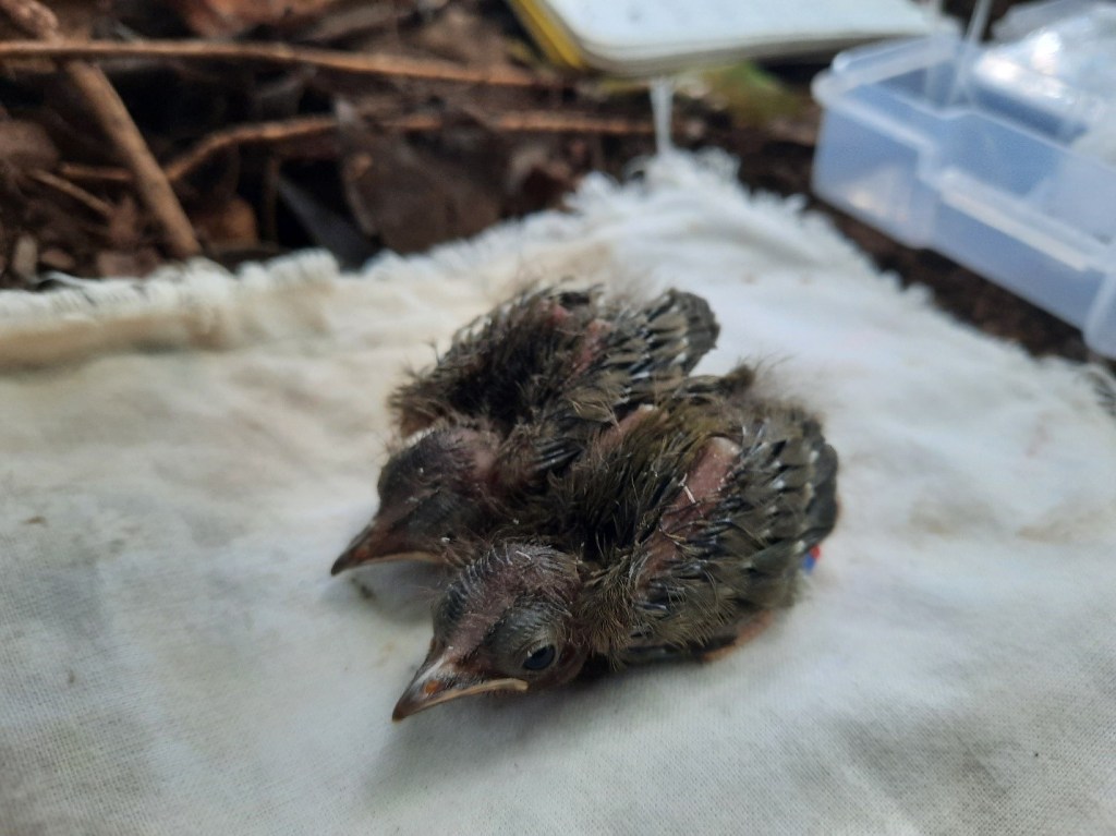 Another part of field work I loved learning was how we collect information on the lance-tailed manakin chicks as they grow. Lance-tailed manakins typically lay two eggs in a nest, although single-egg nests are also possible. When a nest with two eggs in it is found, one of the eggs is taken back to the field house and placed in the incubator to develop in relative safety. This is done so that if the egg in the forest doesn’t survive, we can still collect genetic information from the nest based on the incubator egg. When the chick hatches, they are marked and a small blood sample is taken. The chick is then returned to the nest and the chicks are checked in intervals until they fledge.