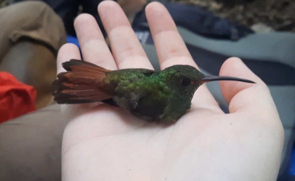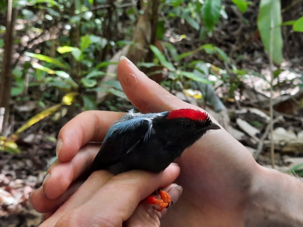 My favorite aspect of field work has been netting. We put very fine mist nets up in the forest to catch lance-tailed manakins. We do this to individually color-band the birds for later identification, confirm which birds are alive, collect blood samples, and gather information on characteristics such as molt patterns, parasite loads, and body condition throughout the season. I was able to assist the field techs in putting up and taking down nets. I was also able to scribe the measurements and any other notes about the birds we captured. Sometimes there would be “bycatch”, or birds other than the manakins, in the nets as well. This was a great opportunity for me to learn how to take birds out of the nets. I was able to take out a hummingbird and an antshrike out of the nets independently by the end of the field season. It was amazing to see the birds up close and learn how to collect relevant data in the field.