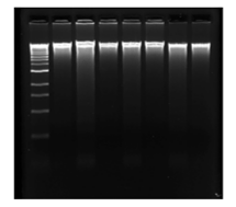 My research project will analyze MNase’s sequence bias through control tests and a new methodology, in which I will be creating, called a gain-of-footprint assay. I will first be completing the control tests. For this, my first step would be to obtain high molecular weight naked DNA. In the lab, I have isolated maize DNA using the Qiagen Plant Maxi DNA kit. Using this kit, I was able to take maize earshoot tissue that was ground into a fine powder, and isolate the DNA through a series of disruptions and separations. Human DNA was generously donated by the J.H. Dennis Lab at FSU and by the Gillespie Lab at Univ. South Alabama. Below are images of the DNA in a 1% Agarose gel. Through these gels, I was able to see that I had high molecular weight naked DNA in at least most of my samples.