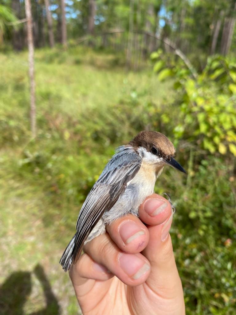 Hello, I’m Traysea Malama-Auger, a rising senior Biology major who is excited to share with you my summer research project on the coordinated vocalizations of brown-headed nuthatches. This project is made possible in part due to the funding I received from the IDEA Grants program, and I’m looking forward to completing it this summer. My research is focused on characterizing the coordinated vocalizations of brown-headed nuthatch pairs. Brown-headed nuthatches are fire-dependent facultative cooperatively breeding birds endemic to southeastern pine forests. Recently, studies have been conducted on other cooperatively breeding species to determine whether loosely coordinated vocalizations met the definition of an avian duet, something I’m eager to apply this methodology to this system this summer.