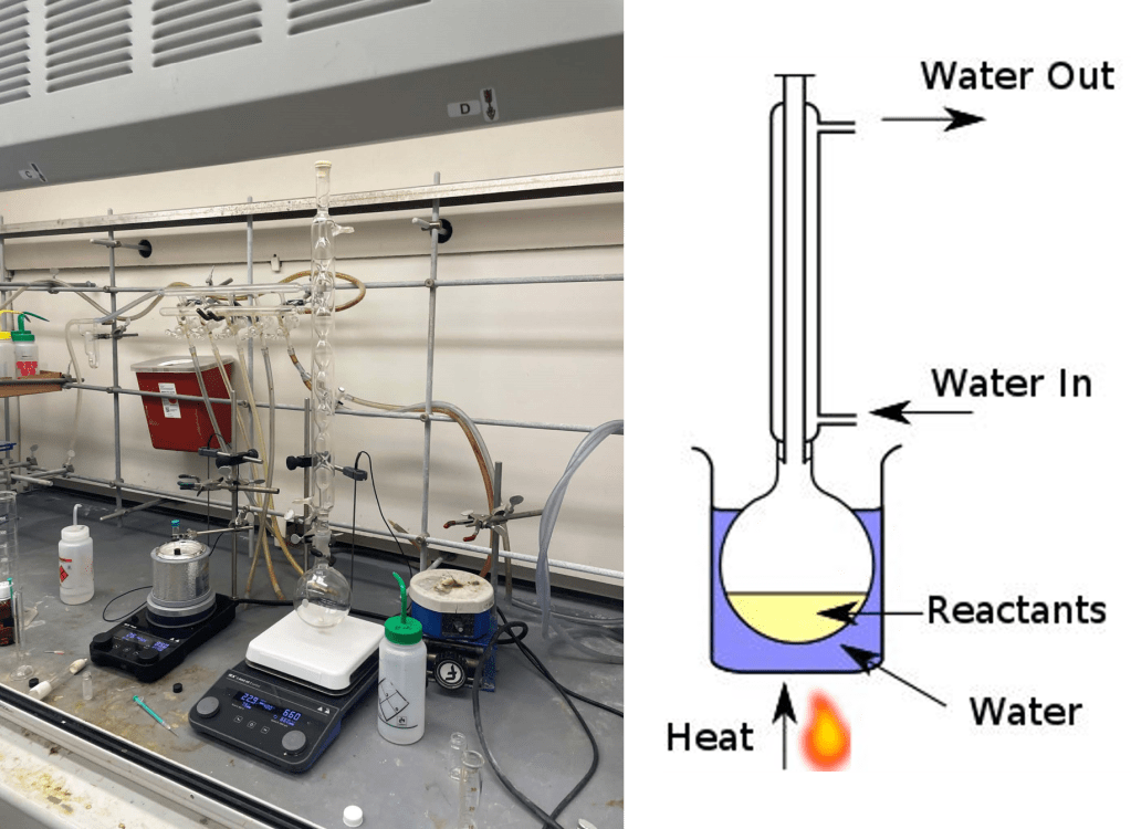 For step one, we will be refluxing (sending the algae through) three different solutions, to bleach the algae and dissolve its lipids (fats) and proteins, leaving us with the cellulose nanofibers. This process is described in an article published in 2017. I have attached an image of the apparatus we are using (in the HSL Chemistry building at FSU), a diagram of the mechanism, and a detailed description of the process.