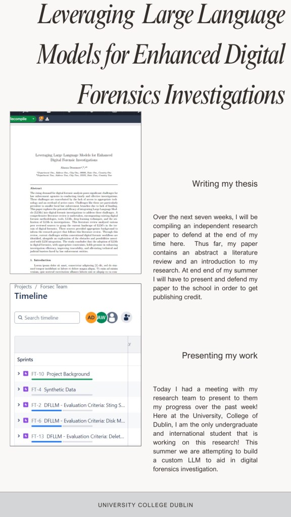 As a Criminology and International Affairs major, my research this summer is centered around building a custom large language model (LLM) to aid in digital forensics investigations. My team consists of myself, my program instructor, and a PhD student who specializes in software engineering. Together, we’re working on creating an accessible tool that could revolutionize digital forensics, making it more efficient and effective for law enforcement agencies worldwide.