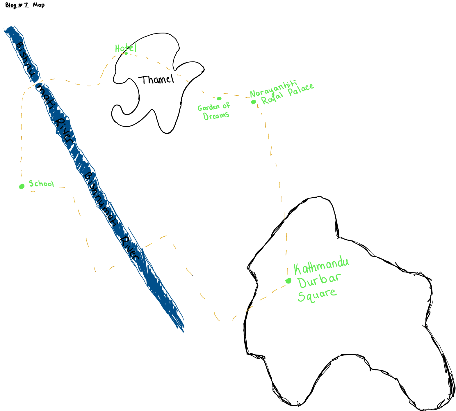 I start off at my hotel, which is on the edge of a well-known tourist area called Thamel. After eating breakfast I walk about 25 minutes to the school where I volunteer. I saw a lot of local places and crossed the Bishnumati River. After my time at the school is done I walk about 10 minutes to the Kathmandu Durbar Square, where the Kathmandu Palace is located. I have been there many times before and since it’s close to the school I like to go there for lunch. Then I decided to go to the Narayanhiti Royal Palace, where the Royal Family of Nepal used to live and the site of the 2001 massacre in which several members of the Royal Family died. It is now a museum open to the public, so I went and spent about 2 and a half hours there. It has been one of my favorite places I’ve been to in Kathmandu so far. After I went there I walked about 7 minutes to the Garden of Dreams, a famous place in Kathmandu. Then I headed back to my hotel to rest, before heading for dinner a couple hours later. For dinner I walk around Thamel and find a local restaurant, which is always delicious.