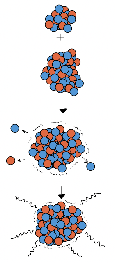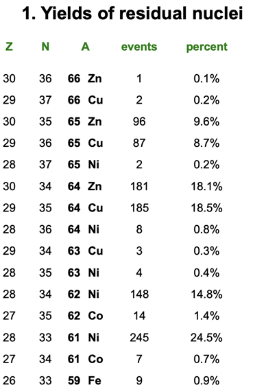 Lets take a look at the reaction I studied this summer as an example. A 55 Mega electronvolt beam of charged oxygen-18 interacts with a solid titanium-50 target and undergoes a fusion evaporation reaction (Figure 1). A fusion evaporation reaction first involves the formation of a compound nucleus as the target and beam fuse together. For this reaction , the compound nucleus is zinc-68. The excited system then radiates protons and neutrons and produces a spectrum of daughter nuclei with varied probabilities (Figure 2).