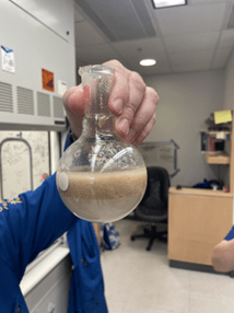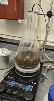Finally, we refluxed the remaining algae in 120 mL of 2M HCl for about 18 hours (4PM to 10AM the following day), using a round-bottom flask in an oil bath set to 110*C. Ideally, this final step would break down the remaining cellulose into its nanofiber components.