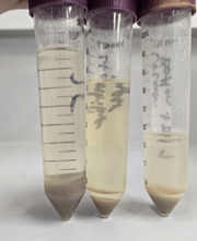 Ms. Bell suggested that we centrifuge the algae samples over at her biology lab, since centrifuges work well at separating biological items from solution. Essentially, the centrifuges spin the tubes of algae at an angle, causing the heavier algae to sink to the bottom. We centrifuged for about 10 minutes total at 8000 RPM and had successful extraction of the algae from the solution.