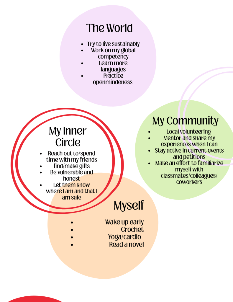 I began on my sphere titled “Myself” to list four behaviors I value to positively impact my daily life: waking up early, working on my crochet projects, practicing daily yoga or cardio, and reading a novel outside of my studies. Secondly, which I strongly tie to the actions for myself, I make sure to spend time with my friends, make them gifts, practice candor, and provide reassuring updates. I found it difficult to differentiate the routines I do for myself and my inner circle. When I check up on my friends, it is often because I miss them and also want a conversation or life update. Similarly, many of the presents I give my close friends and family are crocheted gifts I make myself. The strong connection between these two motivations is because of how close I am to a very tight inner circle: I hold their emotions, lifestyles, and goals a part of my daily life. If I can keep up with my family, my life will follow in productivity; if I weren’t able to talk to them, I would most likely feel unmotivated.