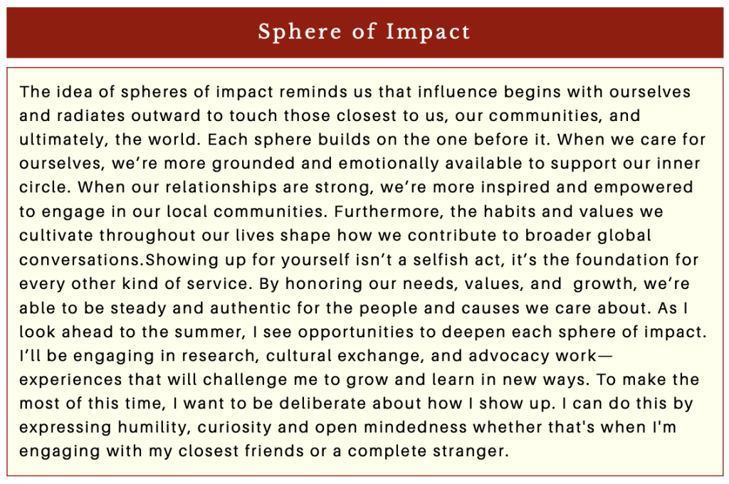 Mapping My Impact Posted byManalMay 28, 2025Posted inGlobal ScholarsTags:Global Scholars By: Jordyn Bain Share this: Click to share on X (Opens in new window) X Click to share on Facebook (Opens in new window) Facebook Like Loading... Related