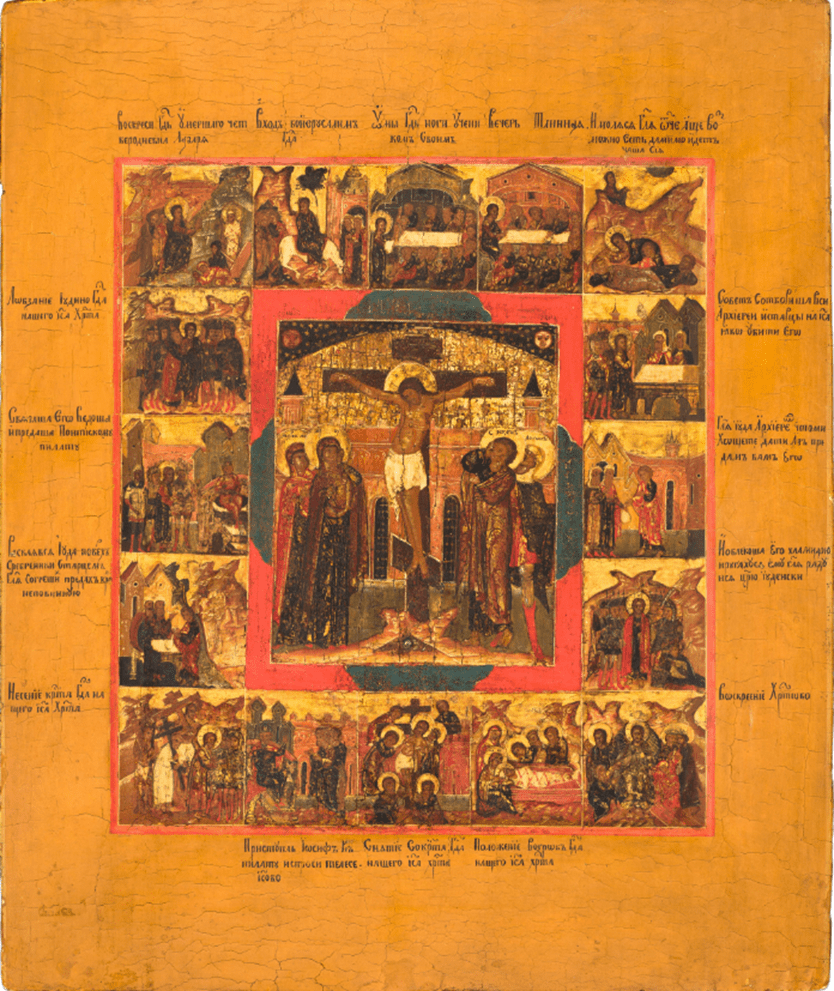 The Crucifixion, with the Passions of Christ and Church Feasts in 16 Border Scenes,17th century, Volga Region, Russia, wood, gesso, tempera
