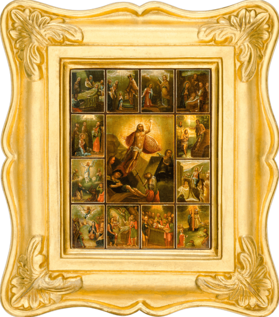 The Resurrection of Christ, with Church Feasts in 12 Border Scenes, end of 19th – early 20th century, Volga Region, Russia, wood, gesso, oil