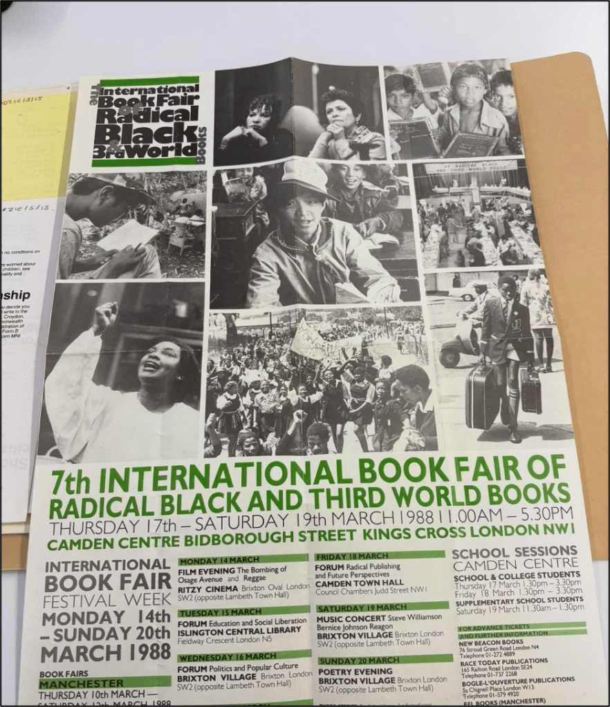 The archival work I’ve been pursuing has been incredibly fun to parse through, but I have come to realize the sheer breadth of the collections is quite intimidating. It has also been more slow-going when it comes to identifying specific literary spaces. Poetry, especially spoken word, comes up more often in ephemeral materials because there are dedicated performances that are held. However, I have been able to find very useful information in the John La Rose Collection at the George Padmore Institute, as he was one of the co-founders of the International Book Fair of Radical Black and Third World Books, which often hosted creative writing workshops or readings by local authors and writers. I have also found many flyers for poetry events in the Stella Dadzie Collection at the Black Cultural Archives! This upcoming week, I will be entering— not just walking by— the London Archives, which I am optimistic about. While I have been able to identify useful information and begin putting together my profiles of different spaces, I know I still have a long way to go!
