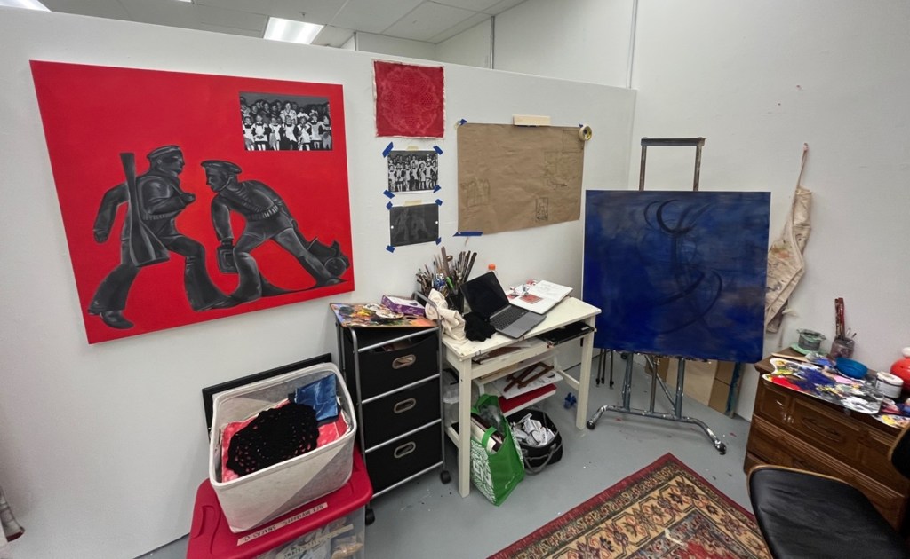 Throughout the month of July, I have begun the start of two major paintings, pictured later in this post. As I was looking through old artwork, I noticed that I had a habit of choosing red and teal as colors, and decided to integrate them as major background colors. For my first painting, I created a piece on a 36×36 inch canvas using a red background as the main point of color. I decided to use a found family image, one from when my older sister grew up in Russia. For the other main subjects, I used an image of metal Soviet military figurines. I’m interested in the way that this artwork uses the family image and the toy figurines to contrast each other, notably in the way gender influences what toys the Soviet Union encouraged.