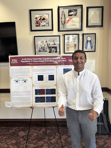 In all seriousness though, sleep deprivation is a global issue and one with a lot of attention. I hope to make an impact in discovering the mysteries behind sleep and sleep deprivation. I have been working with Dr. Lyons, my faculty mentor, and the rest of the lab for a year to date. So far we have measured the changes in RNA expression due to sleep deprivation in the 3 regions of the hippocampus: Dentate Gyrus (DG), CA1 and CA3. If DNA were a huge textbook locked away that gave instructions to build anything you could imagine, then the RNA that we study is a short instruction manual to build a chair for example that was copied from the book on a piece of paper so that we can carry it to a factory to eventually tell the factory how to build the item. The products of these factories help in the formation of spatial memory. We found some results pointing to down regulation in certain RNA molecules (fewer instruction manuals), so fewer factories have access to the plans, and upregulation in others (more instruction manuals), so more factories have access to the plans.